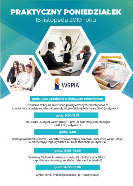 Praktyczne Poniedziałki organizowane są przez Centrum Kształcenia Praktycznego WSPiA Rzeszowskiej Szkoły Wyższej. W najbliższy poniedziałek 18 listopada 2019 r. zaprasza studentów na następujące wydarzenia: