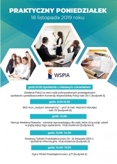 Jest to propozycja ciekawych zajęć ponadprogramowych oraz spotkań z praktykami, która ma stworzyć studentom możliwość dodatkowej aktywności poza dydaktycznej. Dzięki temu studenci mogą realizować swoje zainteresowania wykraczające poza formułę klasycznych zajęć akademickich. Uczelnia proponuje im interesującą ofertę spędzania początku tygodnia w przyjemny i pożyteczny sposób. W każdy poniedziałek organizowane są różne formy aktywności odpowiadające zainteresowaniom studentów. Praktyczne Poniedziałki organizowane są przez działające w WSPiA Centrum Kształcenia Praktycznego.