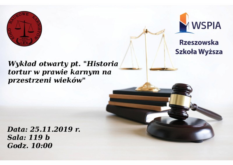 Wykład otwarty pt. „Historia tortur w prawie karnym na przestrzeni wieków” odbędzie się w poniedziałek 25 listopada 2019 r. Początek spotkania o godzinie 10:00. Studentów zainteresowanych tą tematyką zapraszamy do sali 1,19 B (pierwsze pięto, budynek A).