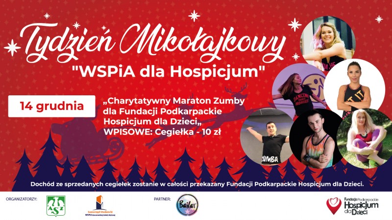 Sobotni Charytatywny Maraton Zumby to ostatni element całego Tygodnia Mikołajkowego WSPiA dla Hospicjum. W ramach wydarzenia Samorząd Studenci oraz Klub Uczelniany AZS zorganizował Charytatywny turniej FIFA, który odbył się w niedzielę 8 grudnia 2019 r. W najbliższy czwartek zorganizowane zostaną także Mikołajki w WSPiA, przez cały dzień studenci będą mogli wziąć udział w Turnieju Futsalu, Ping-Ponga i gry w Piłkarzyki oraz skorzystać z porad specjalistów w Studiu Wizażu. Mikołajki dla studentów WSPiA Rzeszowskiej Szkoły Wyższej odbędą się 12 grudnia 2019 r. w godzinach od 9:00 do 14:00 (więcej znajdziesz tutaj).