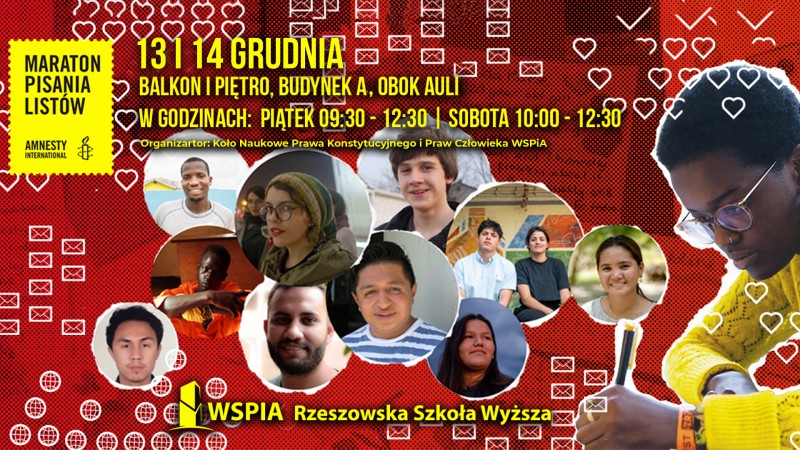 Maraton Pisania Listów w WSPiA Rzeszowskiej Szkole Wyższej organizuje jako co roku Koło Naukowe Prawa Konstytucyjnego i Praw Człowieka. Uczelnia uczestniczy w akcji Amnesty International nieprzerwanie od 11 lat. Maraton organizowany jest zawsze w tygodniu, w którym obchodzony jest Międzynarodowy Dzień Praw Człowieka. W tym roku w WSPiA oprócz tradycyjnych listów będzie można także podpisać petycję on-line, dostępną na stronie Amnesty International. W miejscu pisania listów na terenie Uczelni dostępne będą także komputery, a studenci będą pomagać w wypełnieniu petycji.