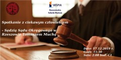 Osoby zainteresowane spotkaniem i rozmową z Tomaszem Muchą Sędzią Sądu Okręgowego w Rzeszowie zapraszamy we wtorek 17 grudnia 2019 r. o godzinie 11:30 do sali 2.08 w Budynku C1 (II piętro – Podkarpackie Centrum Kryminalistyki, Kryminologii i Medycyny Sadowej).
