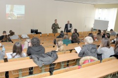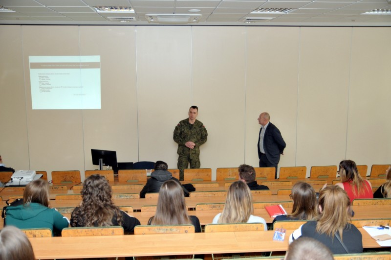 W spotkaniu uczestniczył mjr Konrad Radzik, Szef Wydziału Rekrutacji WKU w Rzeszowie, który zachęcał studentów to udziału zarówno w szkoleniu teoretycznym, jak i praktycznym. Opowiedział o zasadach oraz procedurze naboru kandydatów do projektu „Legia Akademicka”. Przybliżył też efektami i korzyściami, które można osiągnąć po ukończeniu szkolenia. – Macie państwo wiele możliwości. Najpierw jest kurs teoretyczny organizowany w trakcie semestru letniego. Drugim etapem jest kurs praktyczny. Macie do wyboru dwie możliwości: 21-dniowe szkolenia szeregowych rezerwy lub dwa razy dłuższe szkolenie podoficerów rezerwy. Ten kurs kończy się egzaminem i mianowaniem na stopień kaprala rezerwy. Ćwiczenia realizowane są w wytypowanych ośrodkach szkoleniowych Sił Zbrojnych RP w czasie tzw. przerwy wakacyjnej – tłumaczy mjr Konrad Radzik.