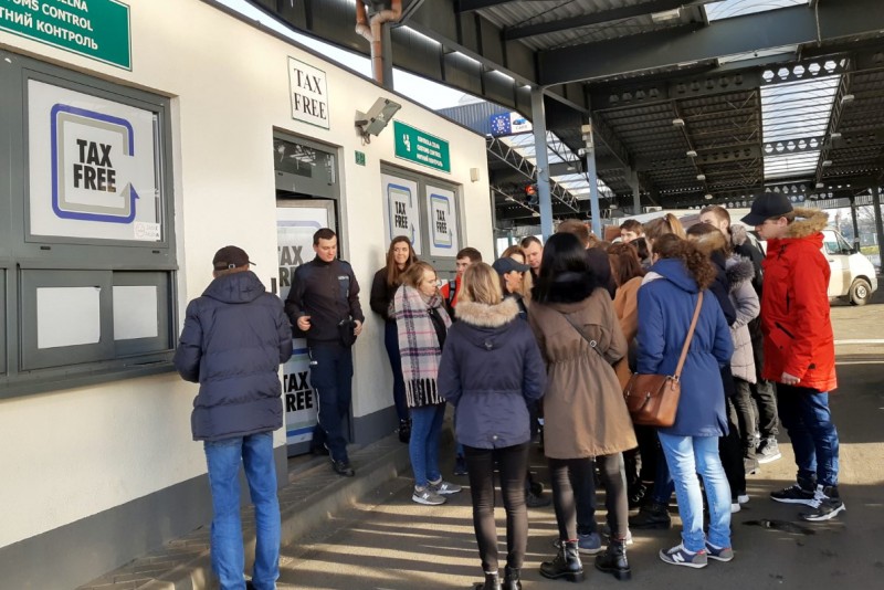 Podczas pobytu na przejściu drogowym w Medyce studenci mogli uczestniczyć w czynnościach kontrolnych dokonywanych przez funkcjonariuszy celno-skarbowych na pasie odpraw dla samochodów osobowych, autobusów oraz samochodów ciężarowych. Przypatrywali się, w jaki sposób funkcjonariusze poszukują i identyfikują skrytki, które mogą znajdować się w kontrolowanym samochodzie ciężarowym.