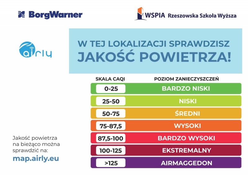 W ramach programu zaproponowanego przez firmę BorgWarner Poland w Rzeszowie zainstalowanych zostało pięciu czujników monitorujących jakości powietrza. Jednym z partnerów projektu została WSPiA Rzeszowska Szkoła Wyższa, która w swoim kampusie zainstalowała jeden z czujników. Wyniki pomiarów na bieżąco można obserwować na specjalnej mapie na stronie http://map.airly.eu/. Dane dostępne są również poniżej.