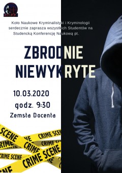 Studencka Konferencja Naukowa pt. „Zbrodnie niewykryte” odbędzie się w najbliższy wtorek 10 marca 2020 r. o godzinie 9:30. Zainteresowanych zapraszamy do klubu studenckiego „Zemsta Docenta”. Dyskusję organizuje Koło Naukowe Kryminalistyki i Kryminologii.