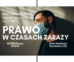 Konferencja naukowa pt. „Prawo w czasach zarazy” odbędzie się w najbliższy poniedziałek 18 maja 2020 r. o godzinie 12:00 na platformie Zoom. Aby wziąć w niej udział, wystarczy kliknąć link https://zoom.us/j/97848042129 (Meeting ID: 978 4804 2129). W konferencji będzie mogło uczestniczyć pierwszych 100 osób. Organizatorem przedsięwzięcia jest Koło Naukowe Karnistów „LEX”, Studenckie Biuro Porad Prawnych „Klinika Prawa” przy wsparciu Centrum Edukacji Dodatkowej WSPiA Rzeszowskiej Szkoły Wyższej.