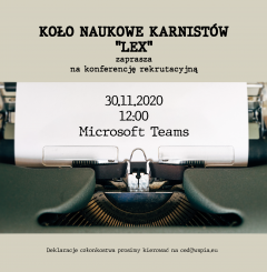 Konferencja naukowa połączona z rekrutacją nowych członków Koła Naukowego Karnistów „LEX” odbędzie się w poniedziałek 30 listopada 2020 r. o godzinie 12:00. Z uwagi na obecną sytuację związaną z pandemią koronawirusa i prowadzeniem zajęć tylko w formie zdalnej konferencja odbędzie się na platformie Microsoft Teams.