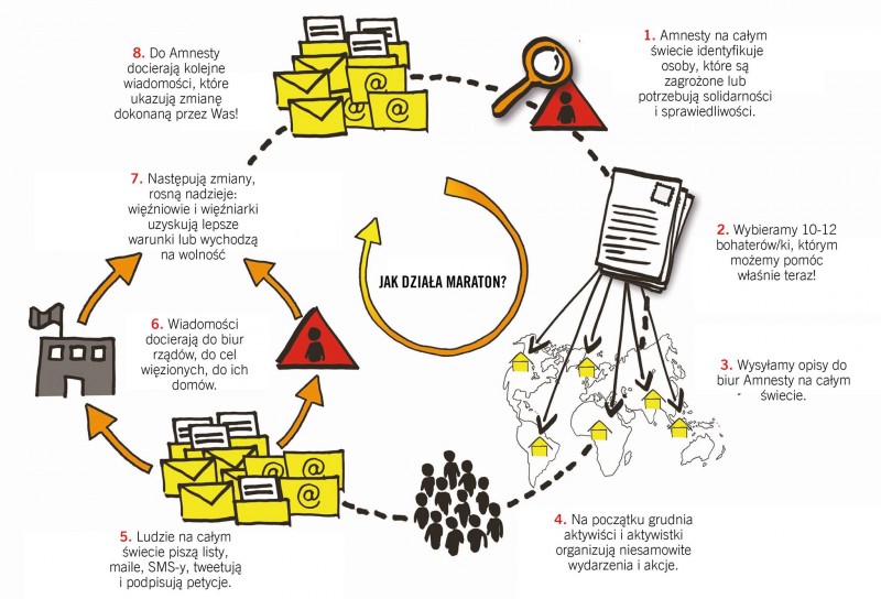 Maraton Pisania Listów to największa globalna akcja na rzecz praw człowieka. Jest to wydarzenie organizowane co roku w okolicach Międzynarodowego Dnia Praw Człowieka (10 grudnia). Data ta jest rocznicą uchwalenia Powszechnej Deklaracji Praw Człowieka – najważniejszego dokumentu dedykowanego prawom jednostki. Idea Maratonu narodziła się w warszawskiej grupie lokalnej Amnesty International w 2001 r. Z czasem Maraton stał się akcją ogólnoświatową, organizowaną w licznych państwach Europy Zachodniej, USA, a nawet w Nowej Zelandii i na Bermudach. Dziś Maraton uważany jest za istotny wkład Polski w globalną świadomość Amnesty International. Podczas wydarzenia na całym świecie miliony ludzi mobilizują się do solidarnego przeciwstawienia się naruszeniom praw człowieka. W 2018 r. setki tysięcy ludzi podjęły ponad 5,65 mln akcji w ponad 200. krajach i terytoriach na całym świecie. W Polsce w ubiegłym roku napisano ponad 30 tys. listów w ponad 850. miejscach w całym kraju.