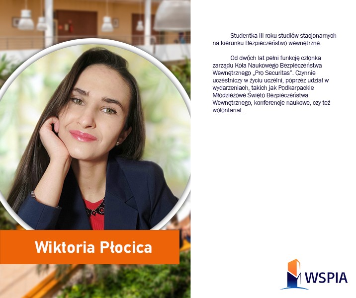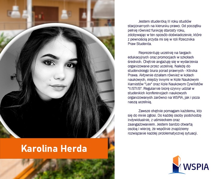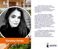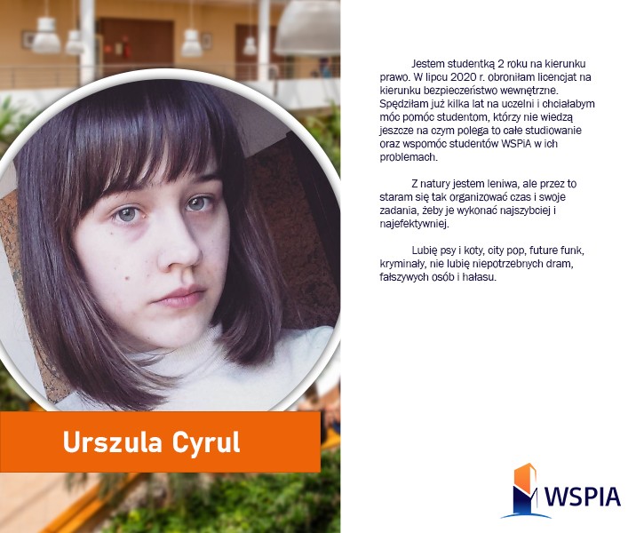 Jest studentką II roku na kierunku prawo w WSPiA. W lipcu 2020 r. obroniła pracę dyplomową na studia I stopnia na kierunku bezpieczeństwo wewnętrzne. Spędziła w Uczelni już kilka lat i chciałaby mieć możliwość pomagania studentom, którzy nie wiedzą jeszcze, na czym polega to „całe studiowanie”. Chce także wspomagać pozostałych studentów w rozwiązywaniu ich problemów. Sama o sobie mówi, że z natury jest leniwa, ale przez to stara się tak organizować czas i swoje zadania, żeby je wykonać najszybciej i najefektywniej. Lubi psy i koty, city pop, future funk, kryminały. Nie lubi niepotrzebnych dram, fałszywych osób i hałasu.