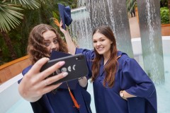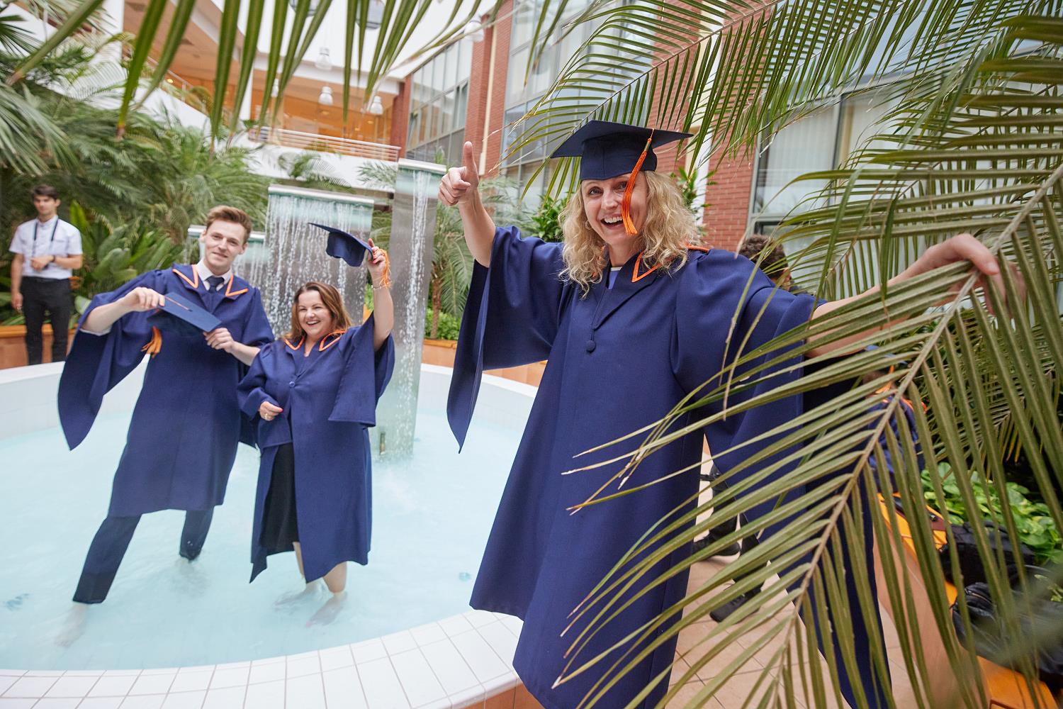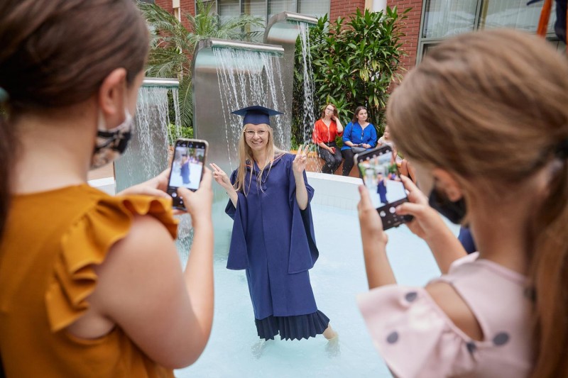 Uroczystość zakończyło pamiątkowe zdjęcie absolwentów i władz uczelni oraz sesja zdjęciowa w Patio i fontannie WSPiA.