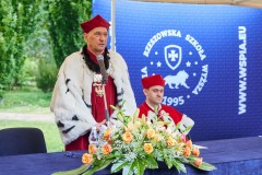 Podczas uroczystej Graduacji głos zabrał także przedstawiciel studentów. W tym roku był to mgr Michał Rzepka, Przewodniczący Samorządu Studenckiego oraz tegoroczny absolwent jednolitych studiów magisterskich na kierunku prawo. – To już pięć lat odkąd społeczność akademicka witała nas w murach tej uczelni. Tamten dzień był tak samo wyjątkowy dla nas jak ten dzisiejszy. Wyjątkowość ta była związana z niepewności, a zarazem sprawdzianem dla każdego z nas jak wygląda prawdziwe dorosłe życie z dala od rodzinnego domu. W murach tej uczelni nieraz padały słowa z ust wybitnych wykładowców, jak naprawdę wygląda dorosłe życie. Bo studia to nie tylko nauka i zabawa, ale także dojrzałość wzbogacona o wartości – mówił Przewodniczący Samorządu Studenckiego.