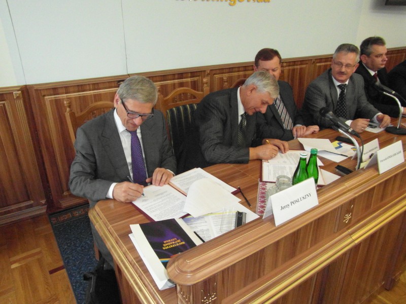 ** Zdjęcie z podpisania porozumienia pomiędzy WSPiA Rzeszowską Szkołą Wyższą a Narodowym Uniwersytetem Technicznym Nafty I Gazu w Iwano-Frankowsku w sprawie podejmowania wspólnych działań naukowych.