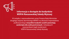 W związku z wprowadzeniem przez Prezesa Rady Ministrów drugiego stopnia alarmowego „BRAVO” na obszarze województwa podkarpackiego wszystkie budynki uczelni pozostają zamknięte dla osób postronnych, niebędących pracownikami bądź studentami WSPiA Rzeszowskiej Szkoły Wyższej.