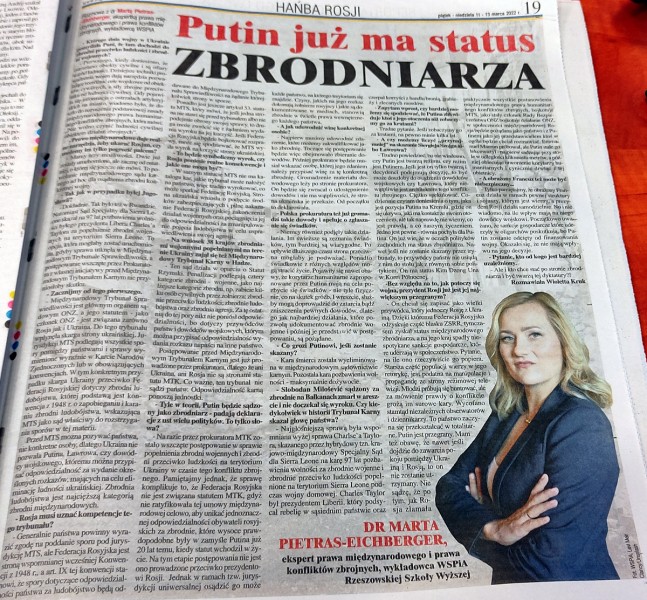 W gazecie Supernowości oraz na stronie Gazety Wyborczej można znaleźć rozmowę z dr Martą Pietras-Eichberger, Prodziekanem Kolegium Prawa WSPiA, ekspertem prawa międzynarodowego i prawa konfliktów zbrojnych. Rozmowy dotyczą m.in. łamania prawa międzynarodowego, sankcji i kar, jakie mogą dotknąć m.in. Władymira Putina.