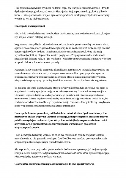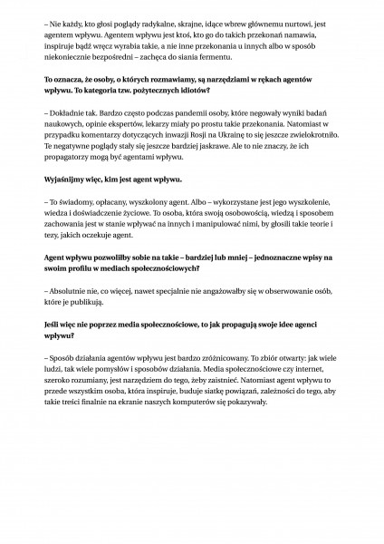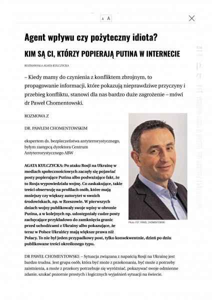 W Gazecie Wyborczej pojawiła się także rozmowa z drem Paweł Chomentowskim, wykładowcą WSPiA, ekspertem ds. bezpieczeństwa antyterrorystycznego, b. Zastępcą Dyrektora Centrum Antyterrorystycznego ABW. Tym razem tematem rozmowy są agenci wpływu, sposób ich działania i wpływania na społeczeństwo.