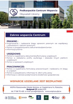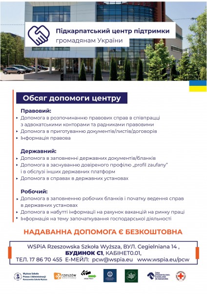 Podkarpackie Centrum Wsparcia Obywateli Ukrainy (PCWOU) WSPiA powstało na podstawie porozumienia zawartego z 6-cioma urzędami i instytucjami. W pomoc włączył się: Urząd Miasta Rzeszowa, Powiatowy Urząd Pracy w Rzeszowie, Izba Przemysłowo-Handlowa w Rzeszowie, Izba Adwokacka w Rzeszowie, Okręgowa Izba Radców Prawnych w Rzeszowie oraz Podkarpacki Oddział PCK w Rzeszowie.