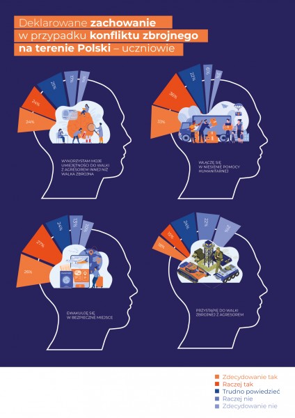 Z raportu wynika, że młodzi ludzie z naszego regionu podjęliby aktywność w przypadku, gdyby konflikt zbrojny dotknął Polski. Przystąpienie do walki zbrojnej deklaruje ponad połowa badanych mężczyzn i co piąta badana kobieta. Młodzi ludzie obronę ojczyzny rozumieją nie tylko jako walkę zbrojną. Według badanych formą obrony kraju może być także pomoc humanitarną oraz inne działania np. dywersja, działania informacyjne w mediach społecznościowych, ataki hackerskie itp.