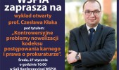„Kontrowersyjne problemy nowelizacji kodeksu postępowania karnego i prawa o prokuraturze” to temat kolejnego wykładu otwartego z okazji jubileuszu 20-lecia WSPiA. Wygłosi go karnista prof. Czesław Kłak. Wykład odbędzie się w najbliższą środę 27 stycznia 2016 r. o godzinie 16:00 w Sali konferencyjnej w rzeszowskim kampusie Wyższej Szkoły Prawa i Administracji.