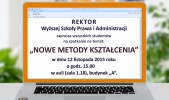 Rektor Wyższej Szkoły Prawa i Administracji prof. Jerzy Posłuszny zaprasza wszystkich studentów na spotkanie, którego tematem będą „NOWE METODY KSZTAŁCENIA”. Spotkanie odbędzie się w najbliższy czwartek 12 listopada 2015 r. o godz. 15.00 w auli WSPiA (sala 1.18), budynek „A”.