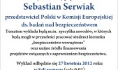 Sebastian Serwiak przedstawiciel Polski w Komisji Europejskiej ds. badań nad bezpieczeństwem będzie kolejnym gościem spotkania z ciekawym człowiekiem w WSPiA. Wykład odbędzie się w najbliższy piątek (27.04) w Sali 0.02 (Sala rozpraw) o godzinie 11:10. Spotkania z ciekawym człowiekiem to cykl wykładów monograficznych dla studentów kierunku „bezpieczeństwo wewnętrzne” w WSPiA. Celem spotkań jest przedstawienie żakom specyfiki zawodów, w których będą mogli w przyszłości pracować.