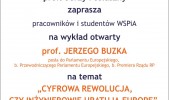 Szanse i zagrożenia związane z rozwojem nowoczesnych technologii oraz konieczność kierowania się etyką w pracach badawczych, to główne wątki wykładu „Cyfrowa rewolucja: czy inżynierowie uratują Europę?”. Wykład dla studentów WSPiA wygłosił gość specjalny Uczelni profesor Jerzy Buzek. W spotkaniu z posłem do Parlamentu Europejskiego, b. Przewodniczącym Parlamentu Europejskiego oraz b. Premierem Rządu RP uczestniczyło ponad 300 osób.