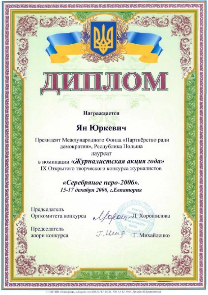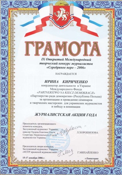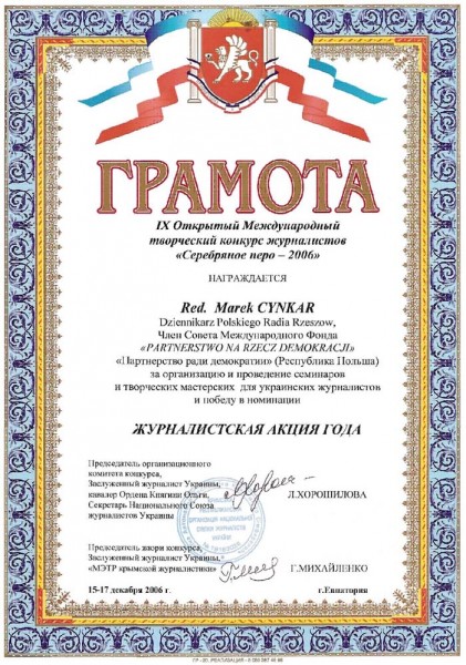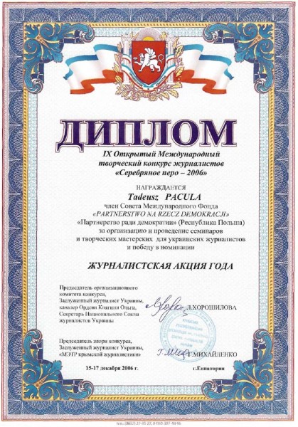 SREBRNE PIÓRO - najważniejszą , prestiżową dziennikarską ukraińską nagrodę otrzymała Fundacja Partnerstwo na Rzecz Demokracji. SREBRNE PIÓRO przyznaje dziennikarzom i dziennikarskim organizacjom Kapituła Konkursowa powoływana przez Stowarzyszenie Dz iennikarzy Ukraińskich oraz Stowarzyszenie Dziennikarzy Krymskich. W XIX edycji międzynarodowego konkursu doceniono programy edukacyjne Fundacji Partnerstwo na Rzecz Demokracji i za nie przyznano jej główną nagrodę w kategorii Dziennikarskiej Akcji Roku. Indywidualnie wyróżniono i nagrodzono współtwórców projektu: redaktora Marka Cynkara - dziennikarza Radia Rzeszów - dyrektora programowego fundacji, który jest autorem większości programów, redaktor Irynę Kyryczenko - koordynatora programu na Ukrainie oraz Jana Jurkiewicza - prezesa fundacji wspierającego program finansowo i organizacyjnie. Dostrzeżono też wysiłki organizacyjne - Tadeusza Pacuły - członka zarządu fundacji. Uroczystość wręczenia SREBRNEGO PIÓRA odbyła się 15 stycznia na Krymie w Eupatorii. W 19 letniej historii nagrody po raz pierwszy wyróżniono organizację z Polski.