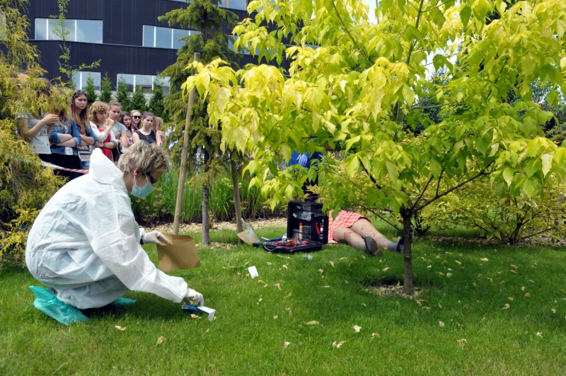Największą atrakcją Dni Prawa Karnego i Kryminalistyki były symulowane oględziny miejsca zabójstwa. Na uczestników imprezy w ogrodach WSPiA czekał manekin imitujący zwłoki Pani Stefanii. Dzięki zainscenizowanej sytuacji Andrzej Bodzioch, wykładowca WSPiA (były naczelnik Laboratorium Kryminalistycznego KWP w Rzeszowie) mógł zaprezentować, jak wygląda praca technika kryminalistycznego. Uczniowie poznali m.in. sposoby zabezpieczania śladów na miejscu przestępstwa. Dowiedzieli się także, że ważne są wszystkie ślady, które znajdują się wokół zwłok. Na miejscu przestępstwa znaleziono wiele śladów biologicznych, nóż, rozbity telefon komórkowy oraz fragmenty ubrania. Takie ślady pozwolą na ustalenie wszystkich okoliczności popełnienia przestępstwa oraz znalezienie sprawcy przestępstwa.