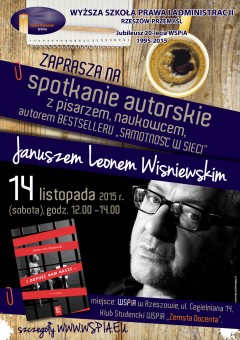 Spotkanie autorskie z Januszem Leonem Wiśniewskim, autorem m.in. książki „S@motność w sieci” oraz „I odpuść nam nasze...” organizowany jest w ramach obchodów 20-lecia WSPiA. Z tej okazji w listopadzie w WSPiA odbędzie się m.in. Dzień Niepodległości, dzień Koła Naukowego Kryminalistyki i Kryminologii oraz Tegoroczny Ogólnopolski Objazdowy Festiwal Filmowy „Watch Docs. Prawa Człowieka w Filmie”. Dodatkowo Uczelnia zaprasza na Podkarpackie Forum Myśli Prawniczej, Konferencję „Ramy organizacyjno-prawne funkcjonowania szkoły” oraz inaugurację Podkarpackiego Forum Klas Prawniczych przy Podkarpackiej Młodzieżowej Akademii Prawa i Bezpieczeństwa.