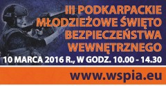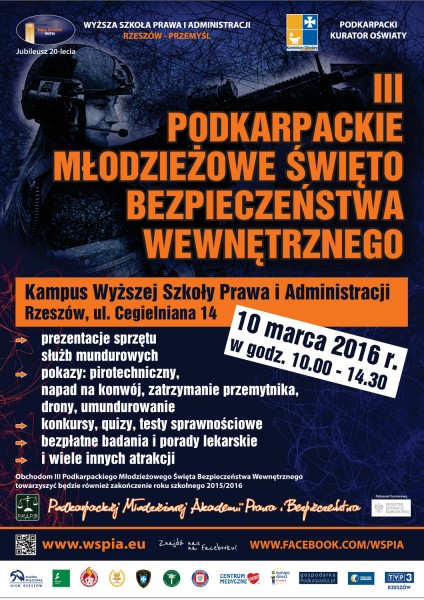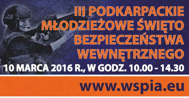 III Podkarpackie Młodzieżowe Święto Bezpieczeństwa odbędzie się w najbliższy czwartek 10 marca 2016 r. o godzinie 10:00 w kampusie WSPiA przy ul. Cegielnianej 14 w Rzeszowie. Impreza organizowana jest wspólnie z Podkarpackim Kuratorium Oświaty pod patronatem: Polskiego Radia Rzeszów, TVP Rzeszów oraz portalu gospodarkapodkarpacka.pl.