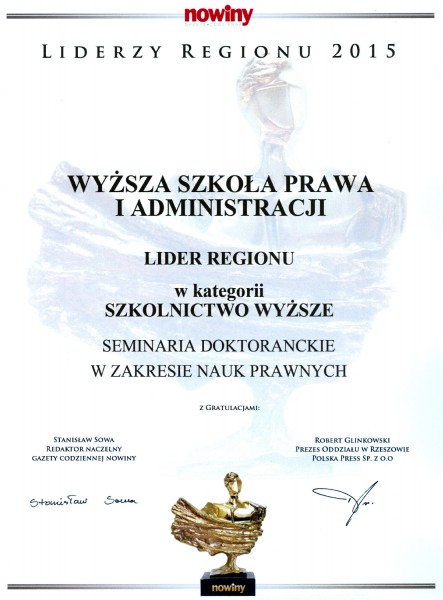 Wśród 36 firm i instytucji znalazła się w tym roku Wyższa Szkoła Prawa i Administracji. Uczelnia otrzymała tytuł Lidera Regionu w kategorii Szkolnictwo Wyższe. Kapituła konkursu doceniła Seminaria Doktoranckie z zakresu nauk prawnych, które WSPiA uruchomiła, jako pierwsza i jedyna uczelnia na Podkarpaciu.