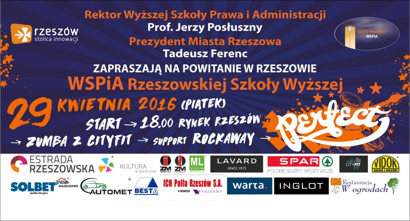 Oficjalnie nowa szkoła wyższa powitana zostanie w najbliższy piątek 29 kwietnia 2016 r. – Śmiało możemy powiedzieć, że WSPiA Rzeszowska Szkoła Wyższa wchodzi do Rzeszowa koncertowo. W piątek na rzeszowskim Rynku odbędzie się bowiem organizowany przez Urząd Miasta Rzeszowa oraz naszą uczelnię koncert zespołu Perfect. Zapraszam wszystkich mieszkańców regionu do świętowania z nami. Koncert rozpocznie się o godzinie 20:00 – zakończył prof. Jerzy Posłuszny Rektor WSPiA.