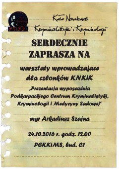Warsztaty wprowadzające dla członków Koła Naukowego Kryminalistyki i Kryminologii rozpoczną się w poniedziałek 24 października 2016 r. o godzinie 12:00. Do udziału w spotkaniu zapraszamy wszystkich studentów zainteresowanych prezentacją wyposażenia Podkarpackiego Centrum Kryminalistyki, Kryminologii i Medycyny Sądowej. Centrum mieści się na drugim piętrze budynku C1.