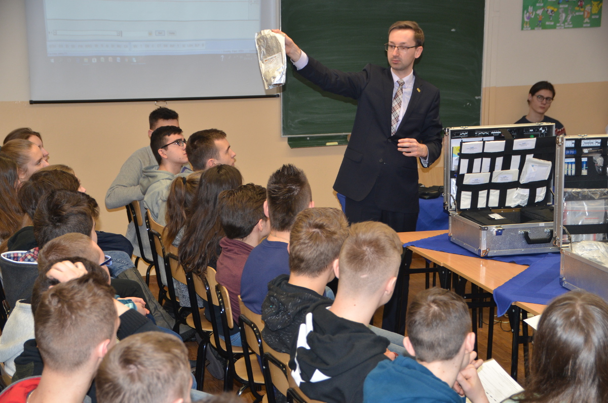 Zajęcia przeprowadził Arkadiusz Szajna, zastępca Dyrektora Kolegium Prawa i Bezpieczeństwa oraz wykładowca WSPiA Rzeszowskiej Szkoły Wyższej. Oprócz gimnazjalistów uczestniczyli w nich również uczniowie II LO, którzy należą do Podkarpackiej Młodzieżowej Akademii Prawa i Bezpieczeństwa. Wystąpili oni jednak w podwójnej roli. Z jednej strony jako słuchacza, a z drugiej jako asystenci prezentujący różne techniki i sposoby ujawniania śladów pozostawionych na miejscu przestępstwa.