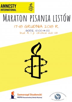 Do udziału w Maratonie Pisania Listów zapraszamy wszystkie osoby chcące wspomóc więźniów sumienia na całym świecie. Wystarczy w dniach 17 i 18 grudnia (poniedziałek i wtorek) odwiedzić budynek główny WSPiA Rzeszowskiej Szkoły Wyższej przy ul. Cegielnianej 14 w Rzeszowie. Członkowie Grupy – Studenci dla Praw Człowieka będą czekać na wszystkich zainteresowanych w patio uczelni w godzinach od 10:00 do 14:00.