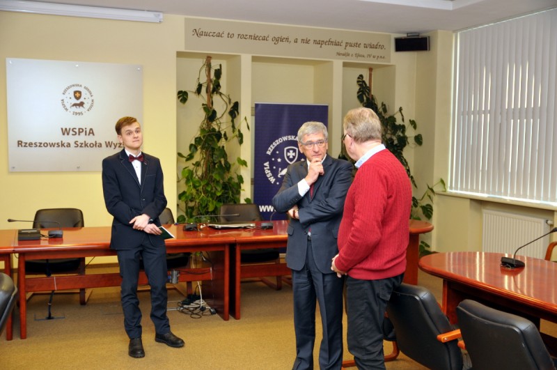 – Bardzo się cieszę, że nasze drogi połączyły się przy okazji Ogólnopolskiej Olimpiady Widzy o Państwie i Prawie. Dzięki temu WSPiA będzie mogła pomóc Panu w rozwijaniu talentu i pogłębianiu wiedzy prawniczej. Jest to pierwszy przypadek, kiedy uczeń długo przed maturą rozpocznie uczęszczanie na zajęcia razem ze studentami. Zastanawialiśmy się jak określić jego status i doszliśmy do wniosku, że najlepiej obrazować go będzie nazwa „Uczeń – Student”. Pokazuje ona kierunek, w którym podąża ten młody człowiek – tłumaczył prof. Jerzy Posłuszny.
