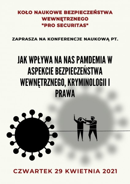 Konferencja pt. „Jak wpływa na nas pandemia w aspekcie bezpieczeństwa wewnętrznego, kryminologii i prawa” odbędzie się w czwartek 29 kwietnia 2021 r. o godzinie 14:00. W spotkaniu na platformie MS Teams mogą uczestniczyć wszyscy studenci naszej Uczelni.
