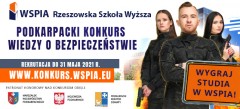 Podkarpacki Konkurs Wiedzy o Bezpieczeństwie w dwóch etapach wyłoni osoby z największą wiedzą z zakresu szeroko rozumianej problematyki bezpieczeństwa i prawa. Zwycięzcy otrzymają cenne nagrody ufundowane przez WSPiA Rzeszowską Szkołę Wyższą. Do wygrania są m.in.: bezpłatne studia w WSPiA, zwolnienie z opłaty rekrutacyjnej na studia, bezpłatne miejsce w Wielomieszkaniowym Domu Studenckim WSPiA oraz cenne nagrody rzeczowe.