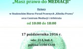 „Masz prawo do MEDIACJI” pod takim hasłem odbędzie się w tym roku „Tydzień Mediacji” w WSPiA Rzeszowskiej Szkole Wyższej. W dniach od 17 do 20 października 2016 r. wydłużone zostaną godziny pracy Klinika Prawa oraz Centrum Mediacji i Arbitrażu. Dodatkowo uczelnia zaprasza do udziału w Seminarium Naukowym pt. „Prawo do mediacji prawem człowieka”. Tydzień Mediacji w WSPiA zorganizowany jest w związku z Międzynarodowym Dniem Mediacji, który obchodzony jest na świecie w każdy trzeci czwartek października.