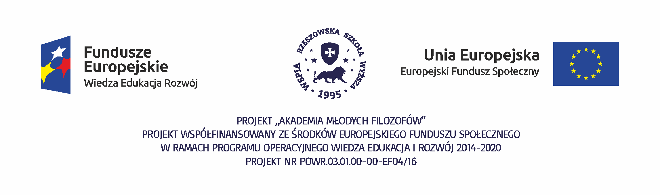 Projekt „Akademia Młodych Filozofów” współfinansowany ze środków Europejskiego Funduszu Społecznego w ramach Programu Operacyjnego Wiedza Edukacja i Rozwój 2014-2020 ma celu nabycie i podniesienie kompetencji ogólnorozwojowych związanych z krytycznym, samodzielnym myśleniem przez 120 uczniów klas drugich i trzecich z 3-ch szkół ponadgimnazjalnych (84K/36M) z Podkarpacia poprzez realizację zajęć fakultatywnych z filozofii przez kadrę dydaktyczną WSPiA Rzeszowskiej Szkoły Wyższej w ramach rozwoju oferty Uczelni w zakresie realizacji trzeciej misji.