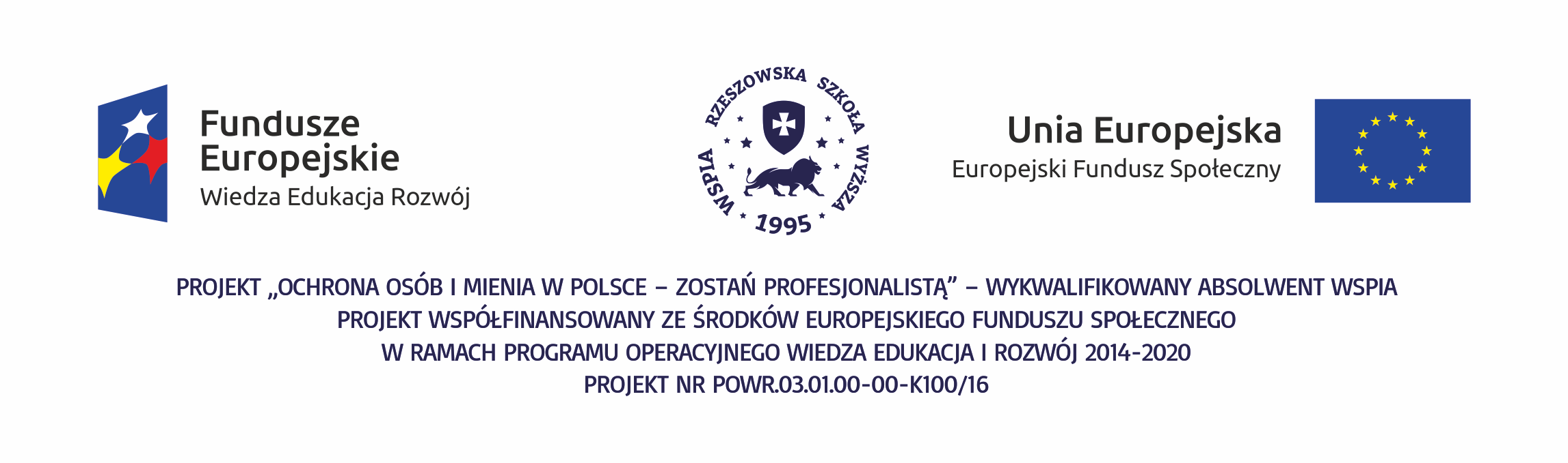 Program Operacyjny Wiedza Edukacja i Rozwój 2014-2020 Oś Priorytetowa III. Szkolnictwo wyższe dla gospodarki Działania: 3.1 Kompetencje w szkolnictwie wyższym Instytucja Pośrednicząca: Narodowe Centrum Badań i Rozwoju Nazwa projektu: "Ochrona osób i mienia w Polsce – zostań profesjonalistą” – wykwalifikowany Absolwent WSPiA" |